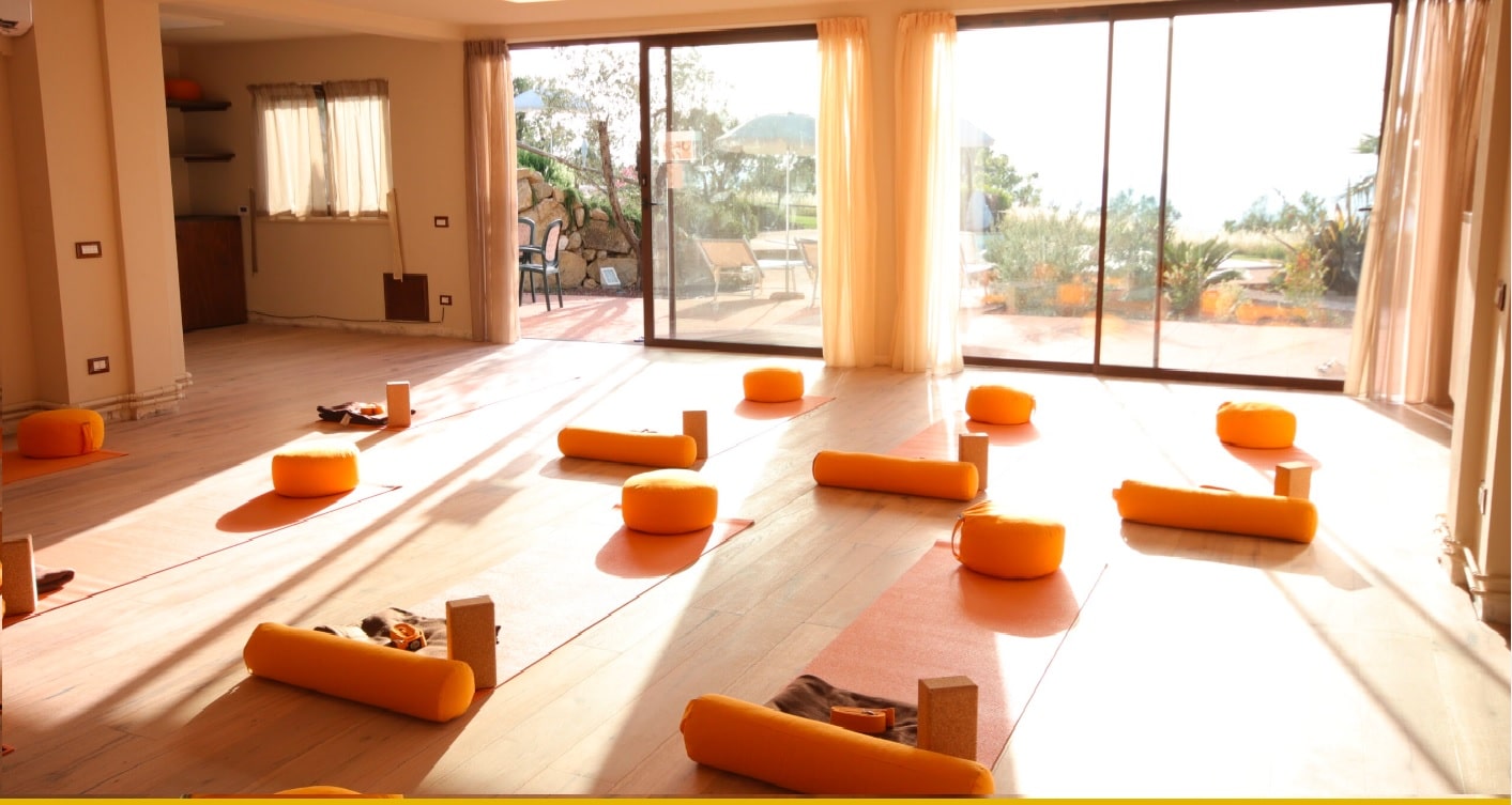 - mit der gesamten Ausstattung wie Yogamatten, Kissen, Blöcke, Bolster, etc.